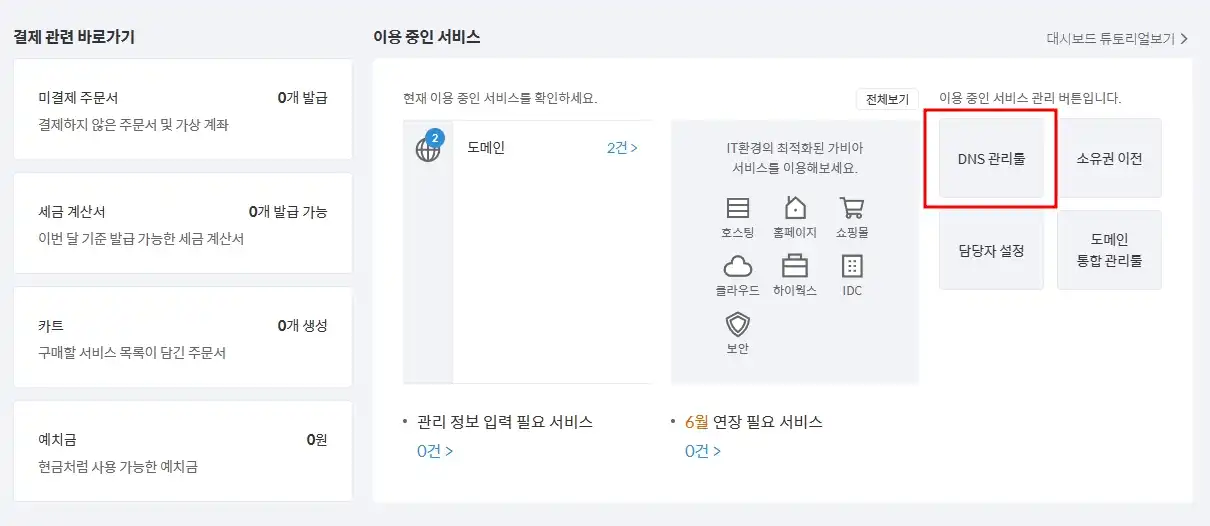 1. 가비아 사이트 접속 및 로그인 > my가비아 클릭 > DNS 관리툴 클릭.